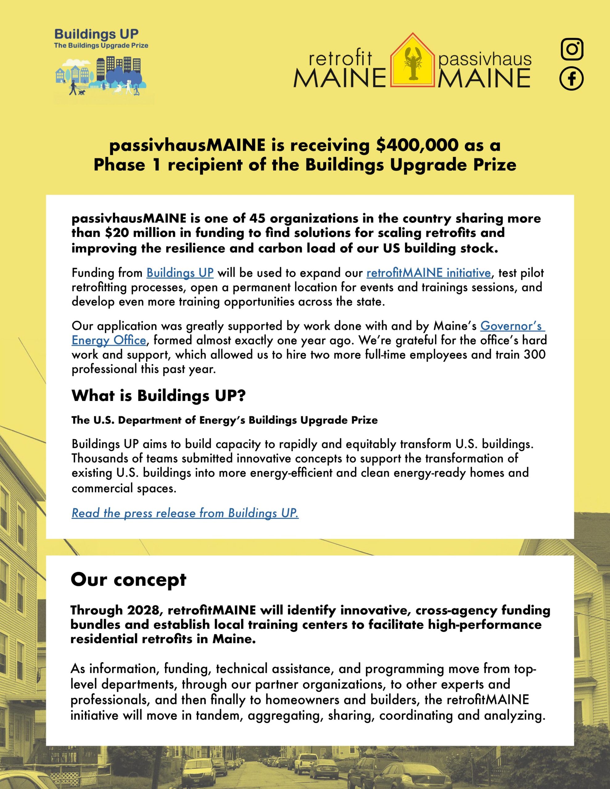 passivhausMAINE has been awarded as a Phase 1 and Phase 2 recipient of the Buildings Upgrade Prize!